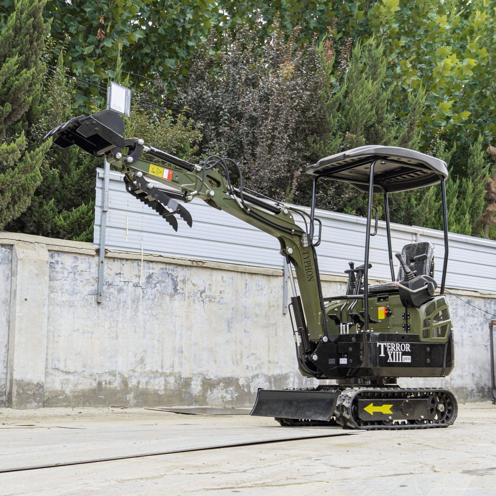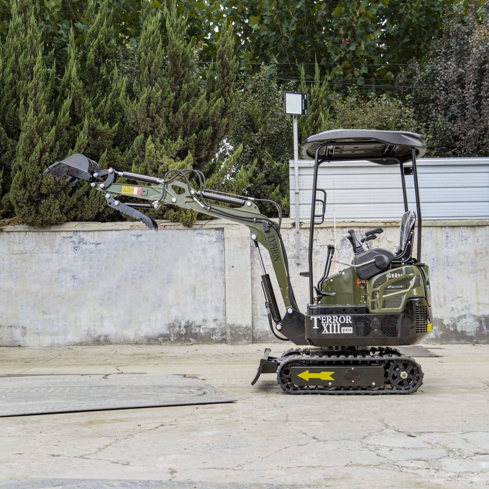 The TYPHON TERROR XIII PRO STORM Mini Excavator is a 1.3 ton trench digger with a canopy and a hydraulic thumb clip. It’s perfect for modest construction jobs. This little but powerful machine is designed to be easy to move around and work well in a variety of places, such as farms, gardens, public spaces, parks, orchards, and more.