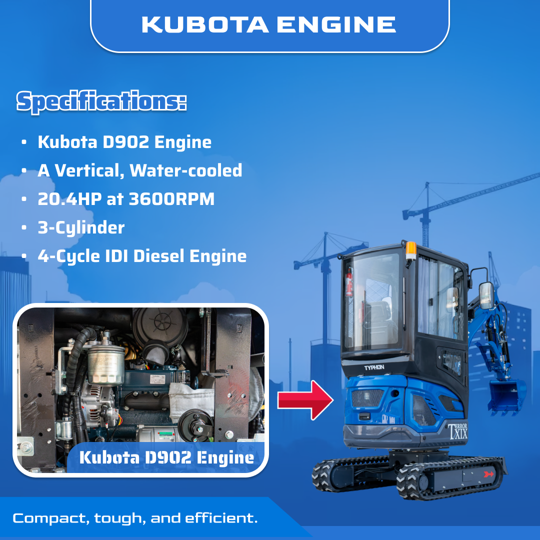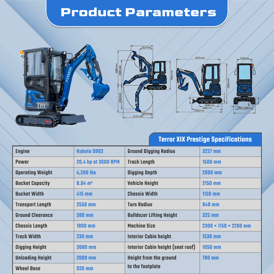 TYPHON TERROR XIX Prestige Cabin mini excavator is made for precision work near structures, curbs, and property lines. If you need a mini excavator that stays predictable on the controls, transports easily, and keeps output steady on real job sites, this model is a strong fit.