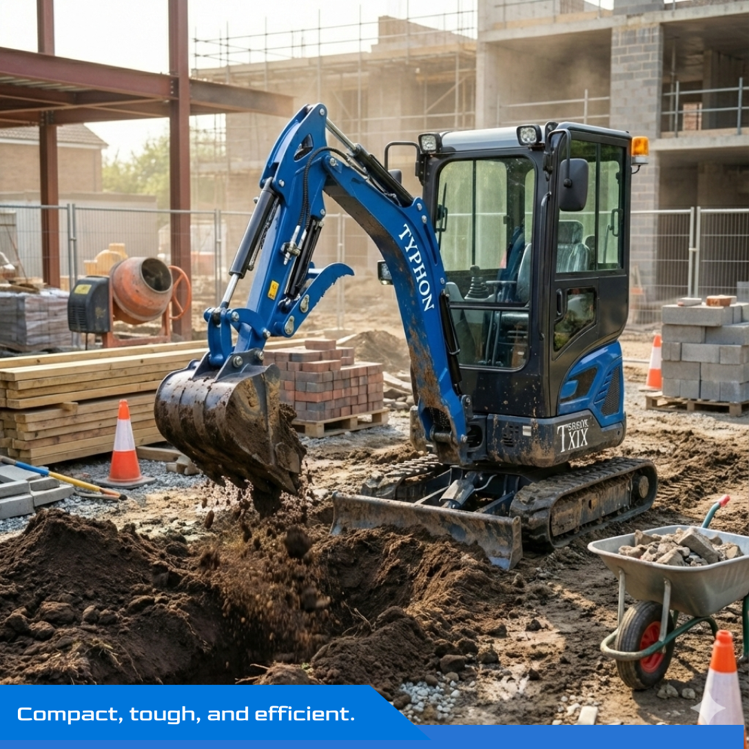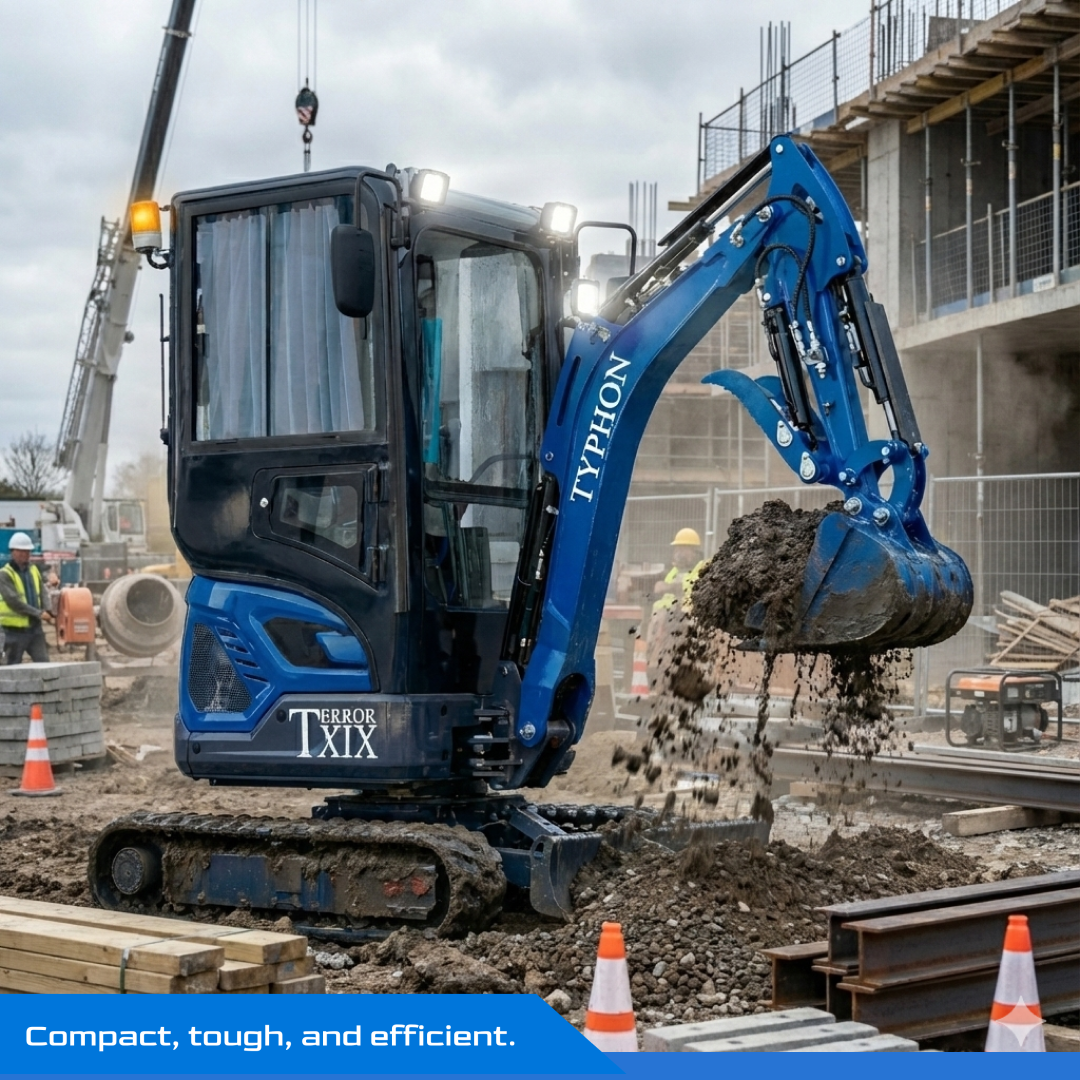 Planning tip: With TYPHON TERROR XIX Prestige Cabin mini excavator, small workflow improvements add up quickly—stage spoil consistently, set depth targets, and standardize trench profiles. Repeatable routines reduce rework and help crews finish faster with cleaner results.