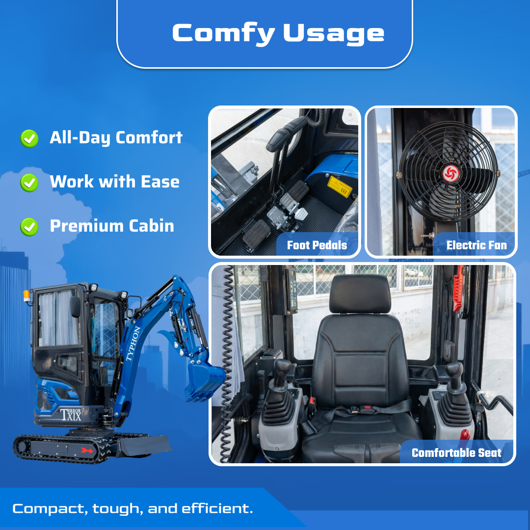 Comfort equals productivity. The Enclosed Cabin setup is aimed at keeping controls intuitive and visibility practical so you can maintain grade and depth targets. When the machine feels predictable, crews work faster with less rework—another reason buyers stick with TYPHON TERROR XIX Prestige Cabin mini excavator for recurring jobs.